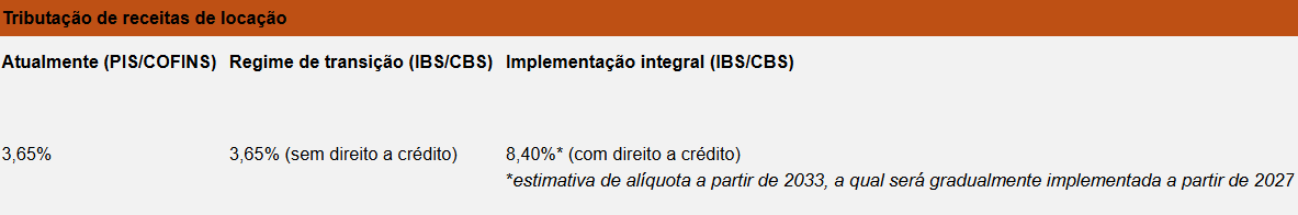 Tais contribuintes poderão optar por um regime de transição, para recolhimento de IBS e CBS com base na receita bruta de aluguéis recebida, à alíquota de 3,65%: